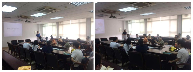下午两点半,课题组的齐炜炜老师在会议室里代表中山医学院生物化学与分子生物学系高国全教授课题组向各位同学的到来表示了欢迎,并为大家简单讲述了课题组的情况:发展历程、课题组成员、研究方向、研究内容等,同时向同学们展示了实验室日常的科研情况。尹浩帆博士生对课题组的肿瘤与淋巴管新生研究做了详细的PPT展示和科普讲解,让同学们初步了解了肿瘤发生过程中淋巴管新生的形成过程,以及淋巴管与肿瘤转移的关系并介绍了课题组研究过的淋巴管新生抑制因子。除此之外,他还向同学们介绍了研究过程中常用的实验方法和实验仪器,让同学们对研究肿瘤和淋巴管新生有了初步的概念。