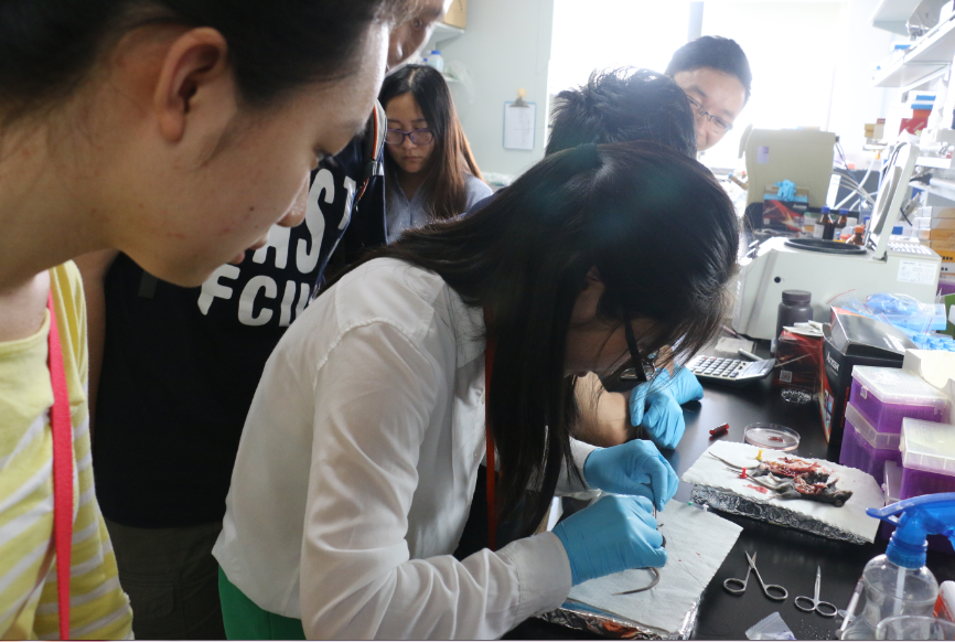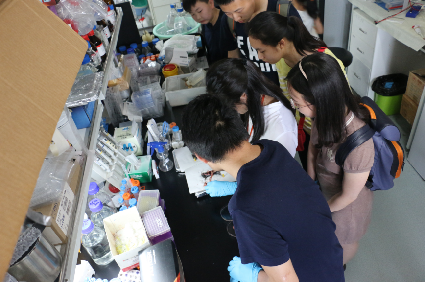 随后,在实验室人员的带领下,向学生们展示了蛋白质双缩脲反应、于显微镜下观察表达荧光蛋白的细胞、小鼠解剖并观察正常小鼠与急性肝炎模型小鼠的肝脏变化、展示小鼠手术等。活动内容丰富多彩,吸引了大家的注意力,参观人员非常认真并善于提问,积极与詹丽杏研究员交流互动,学习知识。