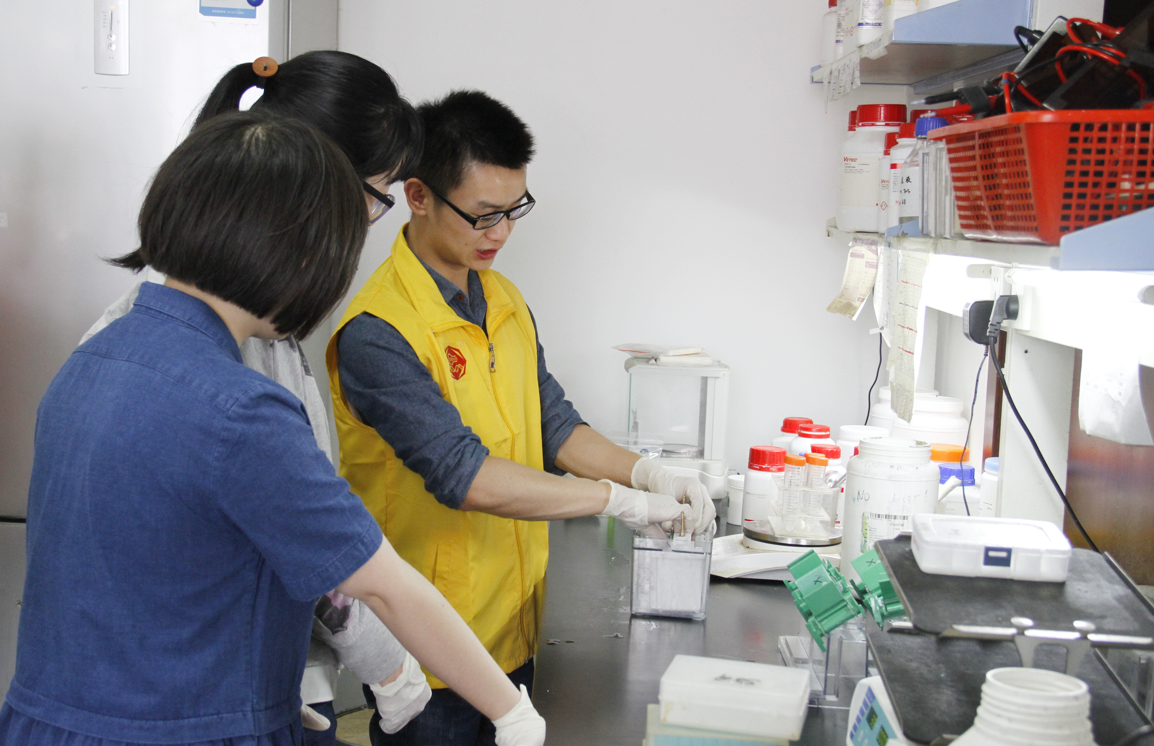 我们先向大家介绍实验室的主要研究内容以及常用的实验方法,并展示了已取得一些蛋白质三维结构以及细胞荧光检测的实验成果。随后,参观者来到实验室参观,由各位志愿者带领,了解实验室常用仪器的使用方法和实验原理、用途。对于一些常用的仪器,例如:蛋白电泳仪、离心机,参观者们还动手进行了简单的操作。为更直观地展示我们在微观水平的研究方法,志愿者还准备了蛋白质结构生物学常用体视显微镜以及培养好的蛋白晶体,不少有兴趣的参观者都在志愿者的帮助下学习了使用显微镜观察晶体。在整个开放活动的过程中,大家还交流了对于癌症防治、药物研发的看法。